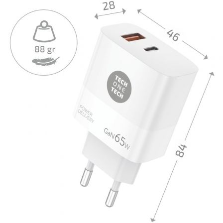 Gracias a sus 2 puertos USB-C y USB-A puedes cargar cualquier dispositivo del mercado (incluido disp. Apple MacBook / Iphone) que tenga un cable compatible para conectar a este cargador, que se adaptará a la tensión de tu dispositivo de forma inteligente. 2 salidas : USB-C 65W y USB-A 18W.